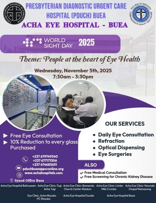 Acha Eye Hospital Buea invites you to join us in celebrating World Sight Day this Wednesday, November 5th, 2025, from 7:30am – 3:30pm at the Synod Office, Buea.